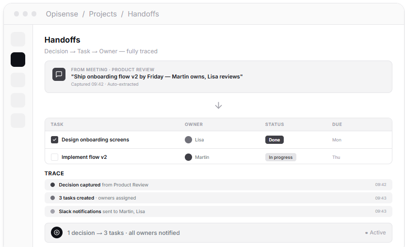 Turn decisions into tasks, ownership, and traceability—without friction.