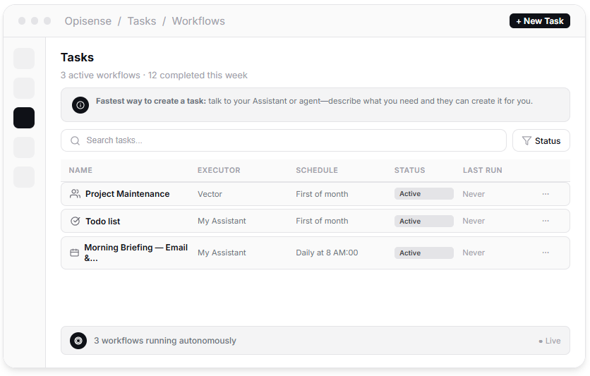 Opisense turns your tools, data, and workflows into intelligent systems that execute work for you — automatically, continuously, and at scale.